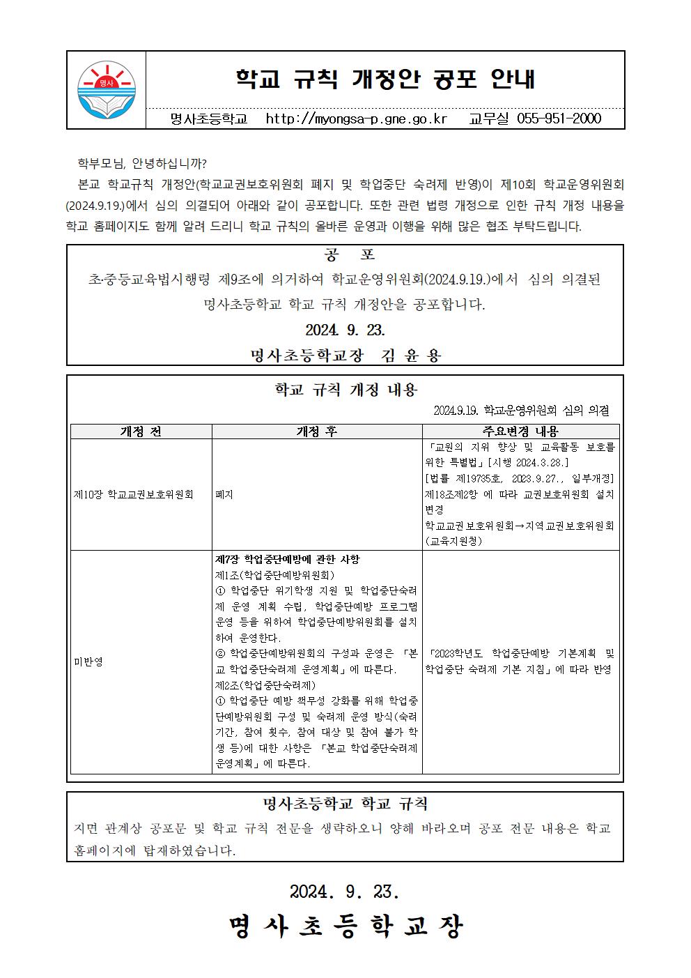 명사초등학교 규칙 개정 공포(2024.09.23.)